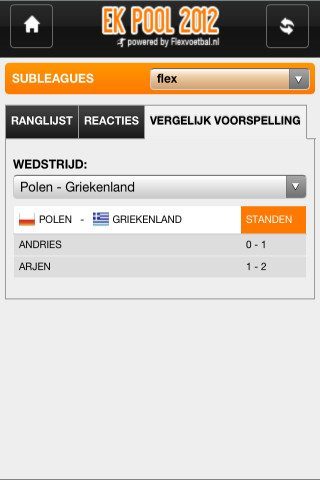 Het leukste aspect van voorspellingen invullen is waarschijnlijk ze vergelijken met die van vrienden of collega’s. Dat wordt in EK Pool 2012 ondervangen met subleagues die je kan aanmaken en waarin je eenvoudig de scores van de deelnemers erop kan naslaan. Je kan ze echter niet aanmaken in de app zelf. Als je de op de knop Subleagues drukt, staat er te lezen dat die op de website van Flexvoetbal moeten worden aangemaakt. Op de website kan je je eveneens aanmelden voor algemene subleagues. Nadat je de handelingen verricht hebt, zie je de subleagues terug in de applicatie. Niet heel handig, ook niet onwerkbaar. Leuk is dan wel dat je niet alleen de totale behaalde punten kan bekijken, maar ook dat je ieders voorspelling van een wedstrijd onder een apart tabblad kan terugzien.