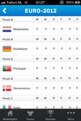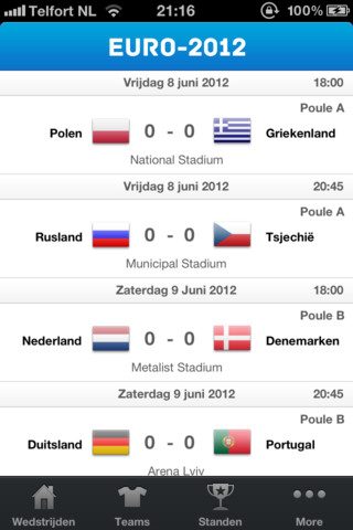 Euro-2012 ziet er in ieder geval overzichtelijk uit. Onderin het scherm vind je vier knoppen die je leiden naar Wedstrijden, Teams, Standen en Meer. Toch is de navigatie een beetje raar. Als je op een van de tabbladen drukt, zie je linksboven in beeld een pijltje staan waarmee je teruggaat. Die stuurt je uiteindelijk altijd terug naar het tabblad Wedstrijden, maar omdat het actieve tabblad waar je bent niet opgelicht staat, vereist de navigatie even gewenning.