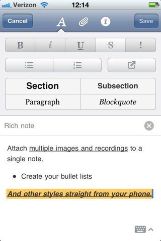 Evernote voor iOS heeft een update gekregen, met RTF-opmaak, toegang tot gedeelde notebooks en een wachtwoordfunctie. Die laatste functie is overigens alleen aanwezig als je Premium-gebruiker bent. Alle andere functies zijn gewoon voor iedereen beschikbaar. Bij het gebruiken van gedeelde notebooks moet je je overigens niet teveel voorstellen: je kunt de notebooks wel bekijken, maar je kunt nog geen losse notities erin bewerken of aanmaken. Heel wat interessanter is de mogelijkheid om tekstopmaak toe te passen. Hiervoor zorgt de ondersteuning voor rich text styles, waarbij je opsommingen met bullets kunt maken, opsommingen met cijfers, vet/cursief/onderstreept, doorgehaald en highlighter.