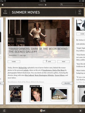 Daarnaast is het net als in Zite en Flipboard mogelijk de verhalen uit je sociale netwerken terug te zien in de app. Je kan de gedeelde links en foto’s vanuit Facebook en Twitter onder aparte tabbladen terugvinden. Ze worden beide vooraf gegaan door een inhoudspagina. Daar vanuit swipe je om naar de verhalen per stuk te gaan. Sommige gedeelde links worden volledig ingeleid met tekst en foto, anderen ontberen die informatie totaal of je ziet alleen een stukje broncode of algemene omschrijving van de pagina die je niet hoort te zien. Een misser, maar je kan altijd op een artikel drukken. Dan het wordt in-app in een browser geladen. Druk op Done linksboven en je keert terug. Naast een artikel staan altijd drie aanverwante dossiers die je kan volgen.