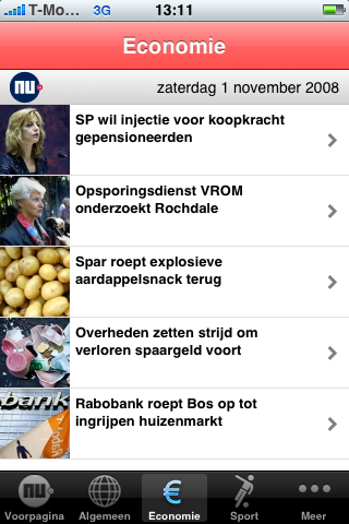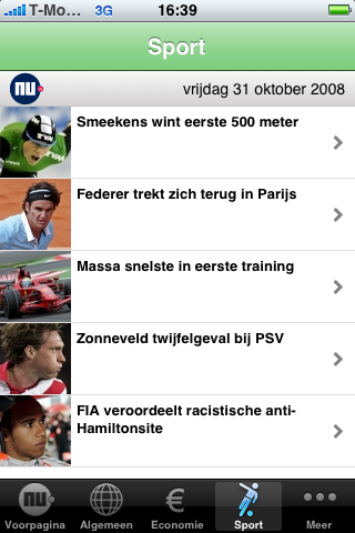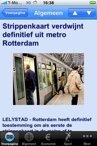 Maar is de iPhone-applicatie ook sneller? Daarvoor hebben we twee identieke iPhones gebruikt, op nog geen centimeter van elkaar, liggend op een bureau en met hetzelfde T-Mobile iPhone-abonnement. Het openen van een nieuwsbericht gaat in de webapplicatie het snelst: met een schuifeffect wordt meteen het artikel zichtbaar. Bij de iPhone-applicatie duurt het steeds nét iets langer, vooral als je de applicatie net hebt opgestart. Het terugbladeren naar de voorpagina gaat bij de iPhone-applicatie wel sneller. Ook handig is dat de secties Voorpagina, Algemeen, Economie en Sport overal in de applicatie snel bereikbaar zijn dankzij de knoppen onderin het scherm. Via de knop Meer krijg je toegang tot de overige secties, zoals Boeken, Auto en Opmerkelijk.