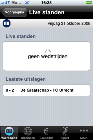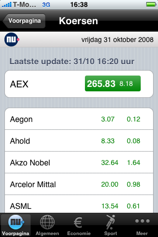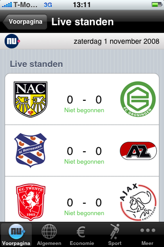 Bij beide applicaties zijn de vier knoppen Weer, Verkeer, Koersen en Live standen zichtbaar. Hier is de iPhone-applicatie sneller: vrijwel meteen verschijnen de live-standen van voetbalwedstrijden in beeld. Ook bij aandelenkoersen is de iPhone-applicatie sneller; al is het alleen maar omdat je meteen de AEX-stand en de koersen van de belangrijkste aandelen in beeld ziet. Bij de webapplicatie moet je nog handmatig op de knoppen AEX, Midkap en Euronext tikken.