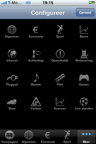 Welke items in de knoppenbalk onder het scherm worden getoond kun je zelf instellen via de knop Meer > Wijzig. Je kunt drie van de vijf items vervangen; Voorpagina en Meer staan op een vaste plaats. Er zijn geen advertenties aanwezig in de applicatie; landscape-weergave wordt niet ondersteund.
