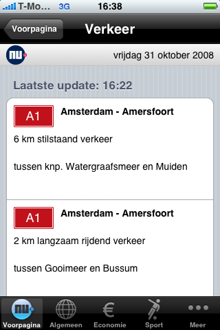 De filemeldingen zijn in de iPhone-applicatie overzichtelijker: grote rode ‘knoppen’ laten meteen zien of er file op snelwegen zoals de A1, A2 en A9 staat, terwijl je bij de webapplicatie door een lijst met kleine lettertjes moet scrollen. Tijdens het autorijden is dat niet erg veilig.