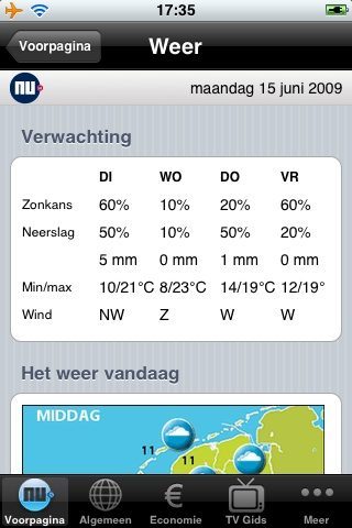 De weerssectie van NU.nl op de iPhone heeft op drie fronten een update gekregen. Er zijn betere kaartjes toegevoegd, op korte termijn zal het weer van vandaag zichtbaar worden én er is op veler verzoek een Buienradar geïntegreerd.