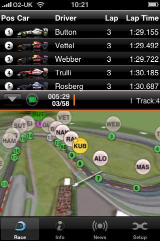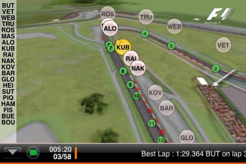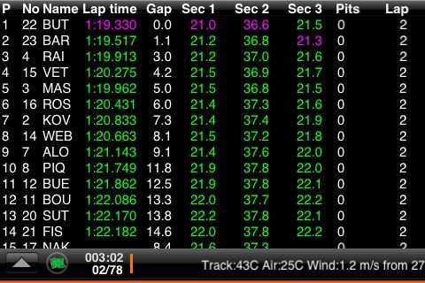 Voor de liefhebbers van Formule 1 is er nu de officiële applicatie F1 Timing. Met F1 Timing kun je onder meer de posities van de coureurs in realtime volgen op je scherm tijdens de training, kwalificatie en de gedurende de wedstrijd zelf. Dit alles weergegeven op een realistische 3D kaart van het circuit. Naast het bekijken van de coureurs op de kaart, kun je ook alle tussentijden bekijken en krijg je per ronde live (geschreven) commentaar.