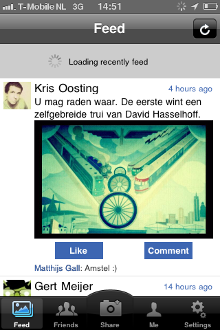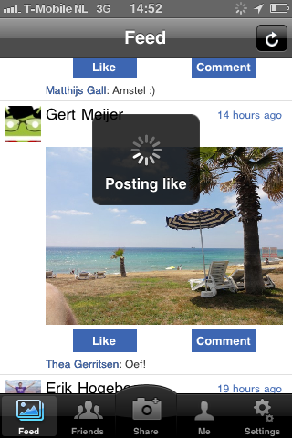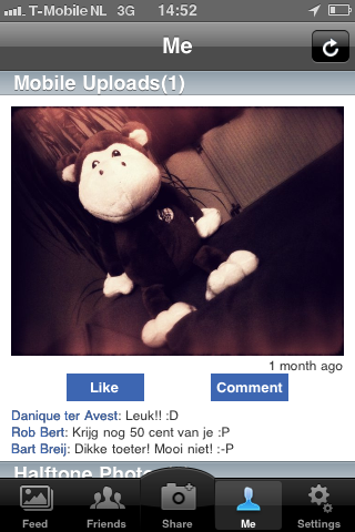Hetgeen wat deze applicatie voor de iPhone en iPod touch de moeite waard maakt, is dat het een functie heeft die het sociale netwerk zelf niet huisvest. Je kan er foto’s mee opslaan. Door op een foto te drukken, wordt de foto gepresenteerd om een zwarte achtergrond. Daaronder staan drie knoppen: Like, Comment en de Save-knop. Onder het menuutje dat onder die knop verschijnt, kun je behalve foto’s opslaan in de Camera Roll trouwens ook een foto e-mailen of jawel: delen via Facebook.