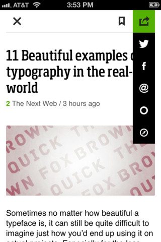 Artikelen worden doorgaans geladen in Feedly’s eigen leesweergave, al geven niet alle sites daar toestemming voor en zo kom je ook wel eens meteen op een website terecht. Die leesweergave is lekker rustig: kop, afbeelding en tekst op een afleidingsvrij wit vel. Rechtsboven tref je een knop om een artikel te delen naar Twitter, Facebook en e-mail. Je kan de link ook openen in Safari en het artikel als ongelezen markeren. De knop ernaast is nieuw: vanaf Feedly 10.0 is het mogelijk om berichten voor later te bewaren in de app zelf (en daarmee meteen als Starred Item in Google Reader), maar ook in de lees-later diensten Instapaper en Pocket.