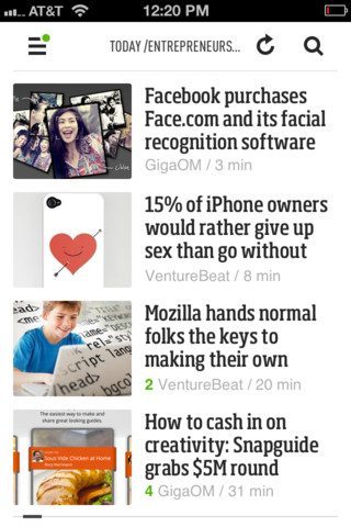 Toch heeft Feedly een eigen gezicht behouden. De universele app is op de iPad echt opgemaakt als een krant met kolommen die in allerlei formaten door elkaar staan, maar houdt op de iPhone het grootst mogelijke overzicht. Tussen verschillende verhalen die het hele scherm beslaan, stuit je op pagina’s met vier vette artikelkoppen onder elkaar. Elke kop voorzien van een foto, de site achter het bericht en het tijdstip van plaatsing.