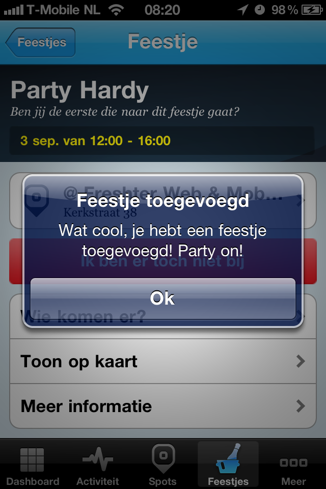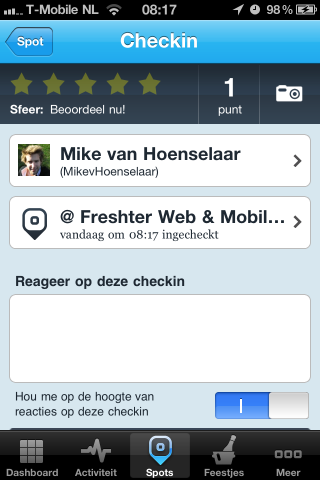 Interface is prachtig. Snelheid is zeer goed. Functionaliteiten zijn goed. Ik vind Feest.je beter dan Foursquare. Toch gebruik Feest.je niet en Foursquare wel. Dit om de simpele reden dat Foursquare veel meer gebruikers heeft. Dat vind ik heel jammer en ik hoop dat ook dat Feest.je in de toekomst meer gebruikers krijgt.