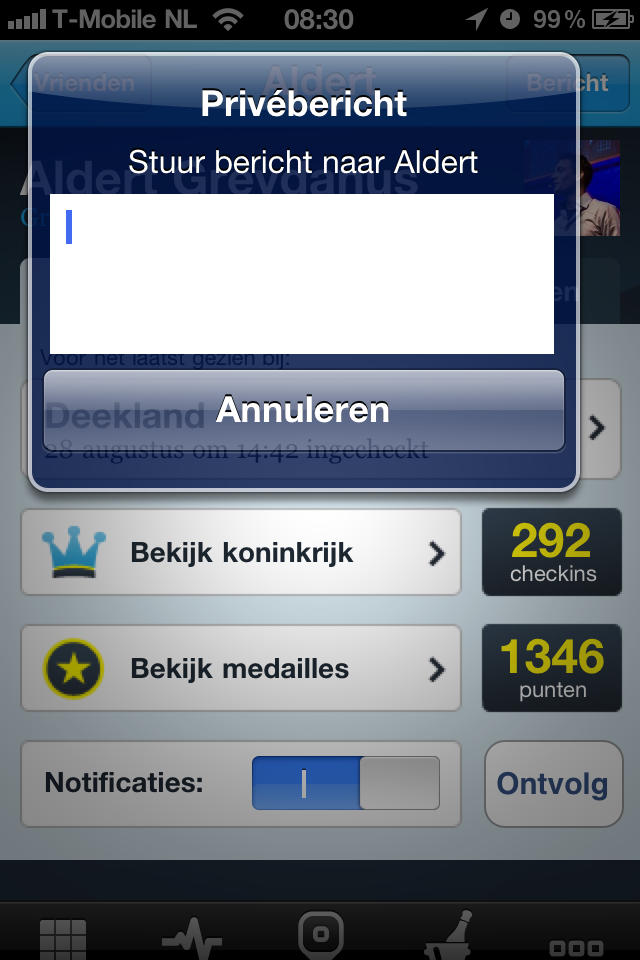 – Je kan reageren op checkins van vrienden en gratis priveberichten naar elkaar sturen. (jo! ik kom er ook zo aan! zet het bier maar koud!)