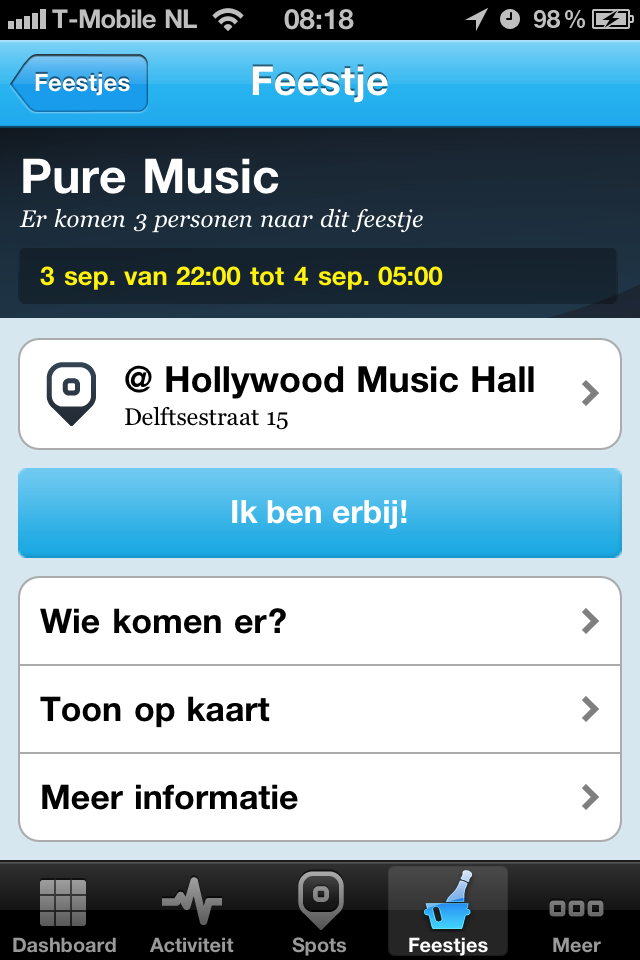 Waarom feest.je gebruiken als er Foursquare is? Dat programma werkt beter en heeft veel meer gebruikers.