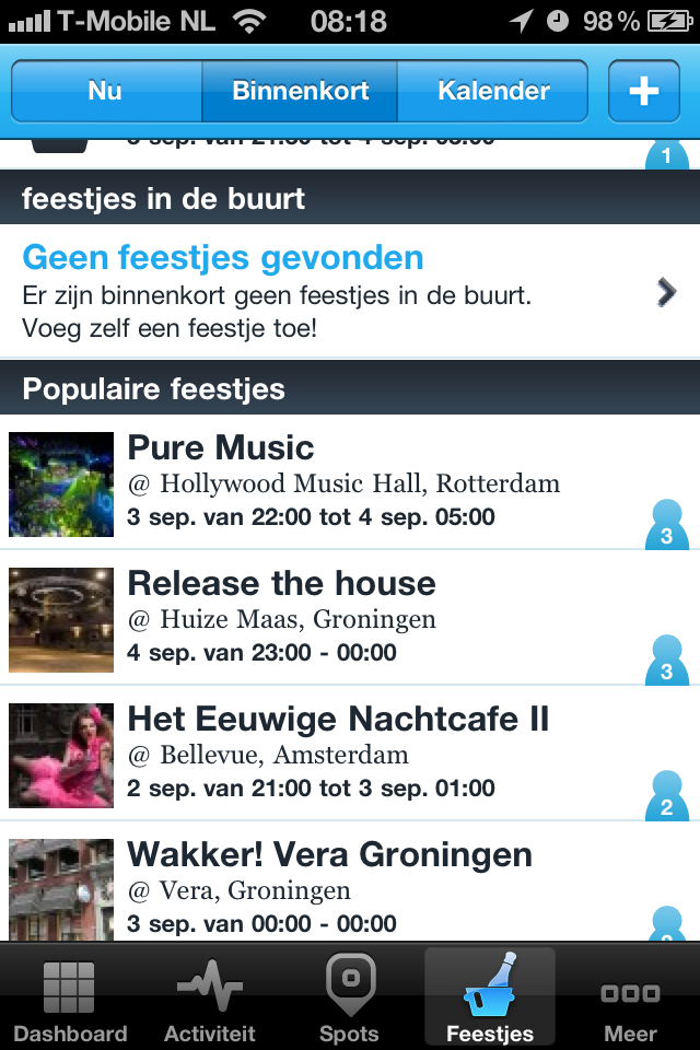 – Je kan feestjes & evenementen ontdekken, aangeven dat je erbij bent en zien wie van je vrienden ook komen. Vervolgens kan je inchecken op het feestje als je er bent aanbeland. Ook kan je zelf een feestje organiseren of toevoegen.(2.0)