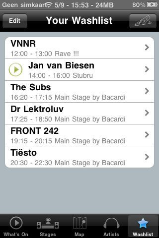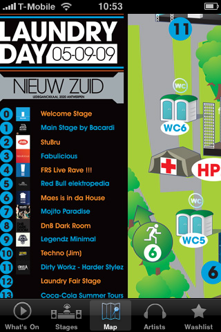 In de applicatie vind je een overzicht van alle verschillende podia die er op Laundry Day zijn. Per podium kun je de line-up zien van de optredende DJ’s en artiesten. Je kunt als je wilt artiesten toevoegen aan je zogeheten washlist, een soort favorieten. Zo zie je in één oogopslag waar je achtereenvolgens moet zijn om deze optredens niet te missen.