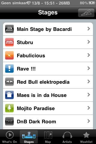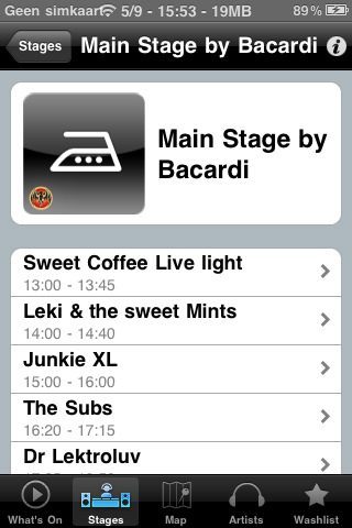 Naast het lezen van een korte biografie en foto van de verschillende artiesten, kun je ook de plattegrond van het festival bekijken. Hierop staan alle podia afgebeeld en zie je bijvoorbeeld waar de WC’s en EHBO-posten zijn. De kaart is overigens gewoon een afbeelding en verder niet interactief. Je kunt dus geen informatie krijgen over de podia door erop te klikken (zoals dat bij de Lowlands-app wel het geval was.)