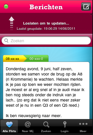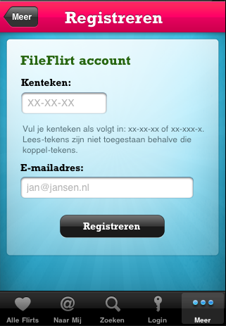Met de applicatie kun je berichten van andere gebruikers lezen, zien of andere gebruikers jouw nummerplaat vermeld hebben en zoeken op nummerplaat. Vreemd is dat de dienst zich vrijwel niet richt op de locatie waar de ontmoeting heeft plaatsgevonden. Zo kun je alleen berichten sturen van nummerbord naar nummerbord en kun je de “waar” alleen bij het bericht erbij vermelden. Ook is er geen ander gebruik van een locatiefunctie in de applicatie. Jammer, want kijken of er FileFlirters naast je staan in de file lijkt me juist erg leuk. De ontwikkelaar heeft aangegeven deze functie te bewaren voor een update. “De app is bedoeld om op een snelle manier berichten naar andere weggebruikers te sturen. Locatie functie is geen must have maar een nice to have feature, we willen de app voor nu doeltreffend en eenvoudig houden. Het kan ook zijn dat er fileflirters thuis op de bank nog een berichtje gaan sturen”, aldus Ronald de Groot van One Shoe.