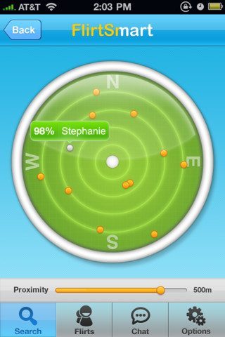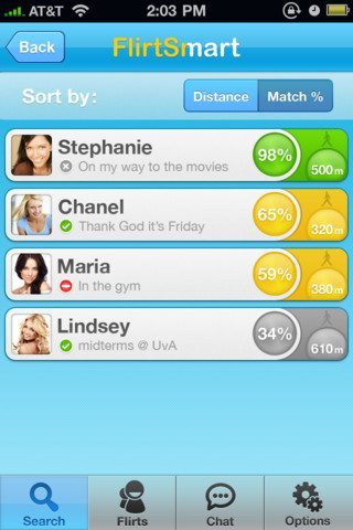 Aan de algemene aanpak van de app hoeft niks veranderd meer te worden. Die werkt ontzettend helder. Het bevat een drie tabbladen naast die van de instellingen, die eigenlijk al op volgorde zijn gezet van algemeen naar persoonlijks. Links zie je het tabblad Search, waarop je nabije leden van FlirtSmart op afstand en op match kan sorteren. Personen staan onder elkaar afgebeeld met profielfoto, online status, afstand en percentage overeenkomsten erbij vermeld. Met twee knoppen bovenin kan je de Flirt View en de Radar openen. De Flirt View is een augmented reality-browser waarmee je met de camera van de iPhone kan rondgaan om te zien in welke hoek van het land de personen zich bevinden. De Radar doet hetzelfde, maar dan op een radar dat je op het scherm ziet.