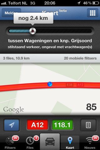 Het weergeven van files op de kaart is een aanrader. Flitsmeister heeft het concept behoorlijk ver uitgewerkt. Zo krijg je op het moment dat je op een file afrijdt, meteen te zien wat de oorzaak van de file is en wat de lengte is. Dat is niet alles: met behulp van eens slider zie je zelfs hoe ver je al bent in de file. Dezelfde truc is toegepast bij de trajectcontroles. Als je in de file rijdt, weet je ook hoe lang het nog duurt voordat je er vanaf bent.