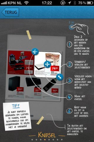Als laatste killerfeature van de app heb je knipsels. Door twee seconden op een folderpagina te drukken, krijg je een selectievak in beeld. De selectie die je maakt kan je ‘uitknippen’ en toevoegen aan een wens- of boodschappenlijst. Als je die vervolgens afvinkt, komt er een streep door te staan. Je kan de lijstjes ook delen.