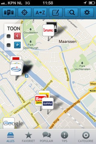 Met de knop Categorie rechtsonder in het hoofdmenu kan je onder andere selecteren op supermarkten, bouwmarkten, elektronica, mode en schoenen, drogisten, telecom, speelgoed en warenhuizen. De tabbladen Populair en Tips bieden een selectie van folders en bovenin kun je folders ook nog bekijken op een kaart. Die functie werkte in ieder geval niet goed in Groningen, terwijl allerlei winkels die in de stad aanwezig zijn, wel folders hebben staan in de app.
