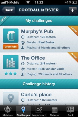Challenges kan wel eens de voornaamste functie van de applicatie worden. Tot nu toe had je twee mogelijkheden om resultaten te vergelijken met vrienden. Het middelste tabblad gaf scores van alle toegevoegde vrienden weer en als dat te onoverzichtelijk werd, kon je met een knop favoriete vrienden toevoegen en daarmee direct de scores vergelijken. Die mogelijkheden blijven in versie 2.0, maar met Challenges kan daarnaast het deelnemersveld opgesplitst worden. Iedereen kan dadelijk een uitdaging aanmaken voor een groep vrienden. De uitdager stelt een prijs in (een rondje in de kroeg, tijdelijke roem of iets anders dat je zelf verzint) en de vrienden die mee mogen doen. Die krijgen een pushbericht dat ze uitgenodigd zijn en kunnen meedoen. De uitdager kan ondertussen instellen welke wedstrijden allemaal in de uitdaging betrokken worden. Aan het einde van de reeks is de winnaar bepaald.
