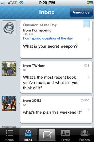 Als je Twitter of Facebook al ziet als een manier om je ijdelheid mee tentoon te stellen, houd dan je hart maar vast voor Formspring. Op deze website maak je een account aan, waarna mensen je allerlei allerlei vragen kunnen stellen. In theorie was het mogelijk om op die manier kennis te delen (ik zou bijvoorbeeld vragen kunnen beantwoorden over de beste iPhone-games). Maar in de praktijk pakten de vragen wel heel erg persoonlijk uit. Formspring is een soort interview waaraan iedereen kan meedoen. De dienst heeft nu voor het eerst een eigen iPhone-app.
