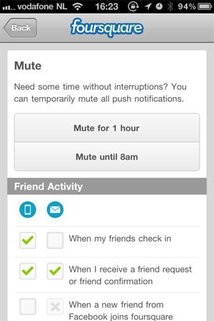 - Een functie die je misschien nog niet kende: Foursquare een uur lang het zwijgen opleggen.