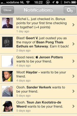 Foursquare heeft een update uitgebracht voor de iPhone-app. Daarin is een nieuw systeem voor notificaties toegevoegd. Het gaat om een zogenaamde ‘notification tray’, die al eerder deze maand verscheen in de Android-app. Je kunt er meer dan alleen checkins mee bekijken: ook commentaar op je incheckmomenten, reacties op zelfgeplaatst commentaar, tips van vrienden en belangrijke statusupdates zijn voortaan te vinden in de app. De app laat ook zien wanneer jouw Facebook-vrienden zich hebben ingeschreven bij Foursquare, zodat je ze als vriend kunt toevoegen.