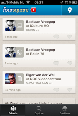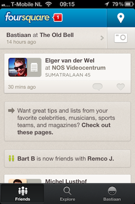 De gedachte gang van de nieuwe update is toch wel veelbelovend denk ik! Foursquare richt zich nu meer op ‘de wereld makkelijker maken’ dan op het inchecken bij een bijv. een cafe. De incheck functie is iets naar ‘achter geschoven’ maar zal je zoekresultaten binnen Explore blijven verbeteren. En daarnaast is de news feed van 4sq (tab friends) vrijwel hetzelfde als facebook, je ziet nu namelijk wat je vrienden liken en welke lijsten ze bewaren.