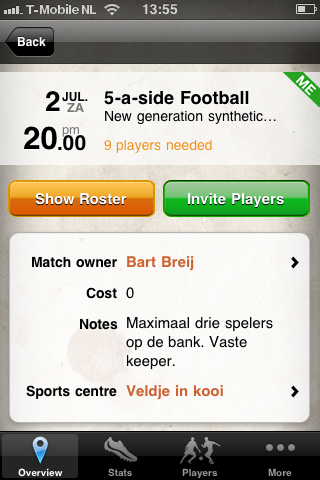Tik een locatie aan en je kan een wedstrijd aankondigen. Daarvoor dien je de begintijd, de kosten (onzin natuurlijk!), de welkome geslachten en het aantal mogelijke reserves aangeven. Dan kun je een omschrijving geven en aangeven of het een privé of publiekelijk potje wordt. Dat is echter niet de laatste stap. Dat is het aannemen van een rol. En dat is verplicht. Je moét aangeven of je een keeper, verdediger, middenvelder of aanvaller bent – al verschilt dat natuurlijk per sport. We kiezen maar middenvelder, krijgen de waarschuwing dat we niet meer van positie mogen veranderen en de afspraak is gezet.