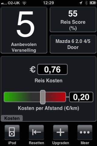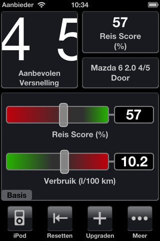 De applicatie vraagt bij de eerste opstarten meteen je locatie. De kern van de app is dat hij namelijk de snelheid van de auto meet met GPS en aan de hand daarvan berekent hoe zuinig je optrekt, remt en rijdt. De gegevens worden gepresenteerd tegen een rustige, zwarte achtergrond. Na het kiezen van het automodel zie je linksboven de aanbevolen versnelling voor de snelheid waarin je rijdt, staat rechtsboven een statistiek naar keuze en daaronder staat een groot vak met statistieken waartussen je kan swipen. In het basis-menu tref je daar de reis score (gemiddelde van factoren) en het gemiddelde verbruik in aantal liter op 100 kilometer. Met een swipe kom je terecht bij Brandstofbesparingen en zie je scores van versnellen, remmen en snelheid in de laatste 3 minuten. De andere menu’s om uit te kiezen, laten zich betalen.