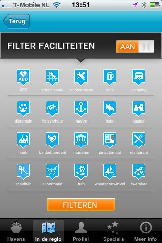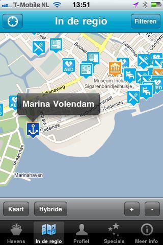 Het tweede tabblad heet In de regio en daarin wordt je locatie op de kaart getoond. Aan de hand van een filter kun je aangeven welke faciliteiten in de regio zichtbaar moeten zijn. Helaas zijn de meeste havens, net als alle andere pictogrammen op de kaart, lichtblauw gekleurd. Een andere kleur had ze er meteen doen uitspringen.