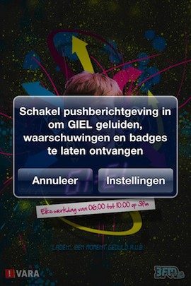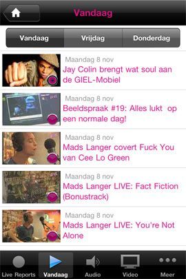 Giel Beelen heeft vanaf vandaag zijn eigen iPhone-applicatie: GIEL. De app heeft een startscherm met maar liefst twaalf knoppen, die allemaal te maken hebben met de ochtendshow die van 6:00 tot 10:00 uur te beluisteren is bij de VARA op 3FM. Je vindt er bijvoorbeeld Live Reports, liveverslagen van dingen die Giel onderweg tegenkomt. Als je de Alert-functie hebt ingeschakeld krijg je meteen een waarschuwing als er iets leuks te beleven is, zodat je live kunt meekijken.