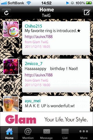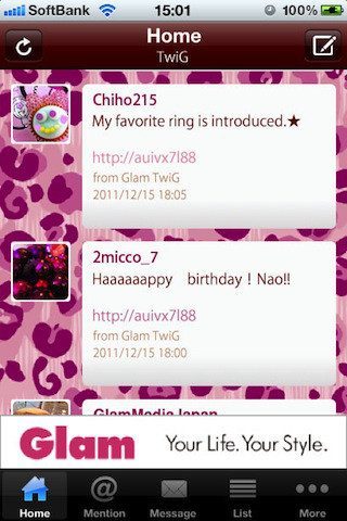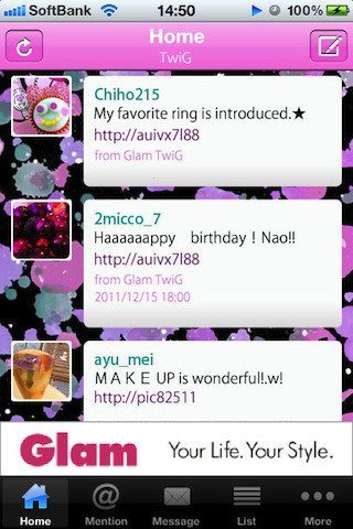 GlamTwiG iPhone iPod touchGlamTwiG is een nieuwe Twitter-cliënt voor de iPhone en iPod touch en zegt af te willen rekenen met de applicaties die allemaal op elkaar lijken. Daarom heeft het een ‘Twitter-app met stijl’ neergezet en dat kun je vrij vertalen als: een Twitter-app die volledig in een roze-paarse-donkerrode stijl is gehuld en is gericht op meisjes. Je kan vanuit de applicatie gewoon je timeline, mentions, privéberichten, lijsten en zoekopdrachten benaderen.