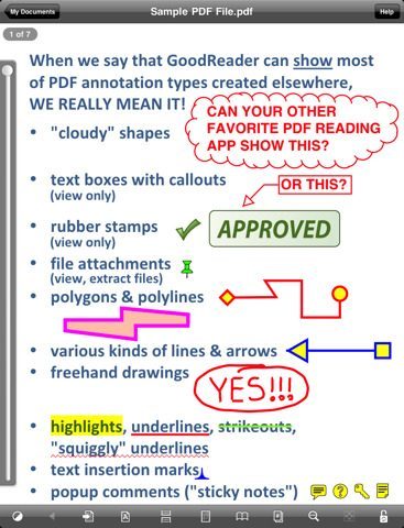 PDF-documenten die in andere programma’s zijn voorzien van aantekeningen zijn ook te openen in versie 3.0 van GoodReader. Veel soorten standaardaantekeningen worden ondersteund en zijn ook te bewerken in de applicatie.