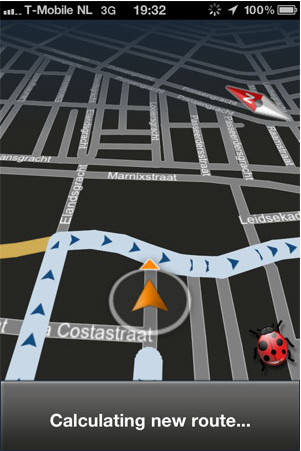 Bij het navigeren heb je nog steeds de keuze uit een 2D of 3D-weergave. Je ziet in beide gevallen een groot deel van het wegennet om je route heen. Voordat je rijdt, kom je in de Panning-modus terecht waarin je kan instellen hoe ver in- of uitgezoomd de kaart staat. Door linksboven Back te drukken koers je naar het navigatiescherm waarin staat hoe lang je nog moet rijden, hoe lang je hebt gereden en hoe goed het GPS-signaal is. Met het rode lieveheersbeestje kun je meteen een bug doorgeven van allerlei soorten, zoals een incompleet adres, een verkeerd berekende route of het ontbreken van de snelheidsindicatie in de app. Overigens kun je tijdens het rijden via het menu eenvoudig naar de map van je iPod luisteren en ook een nachtstand is aanwezig.