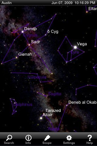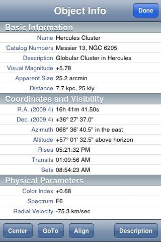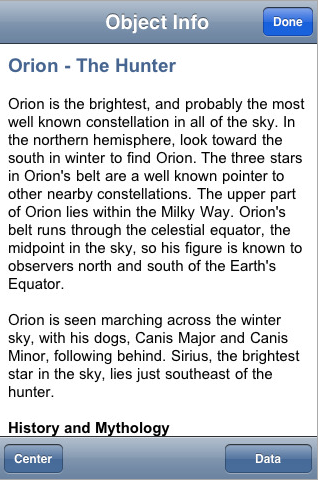 Het hele pakket wat je bij SkyGazer krijgt zit ook in SkyVoyager, alleen dan nog een behoorlijk stuk uitgebreider. De database van SkyVoyager bevat informatie over 300.000 sterren en meer dan 30.000 zogeheten deep-sky objects. Het laat de maan en de planeten in detail zien, gebruikmakend van NASA’s missie-foto’s. Ander extraatje is dat je, als je een computer-controlled telescoop hebt, je deze kunt bedienen met behulp van SkyVoyager. Hiermee kun je je telesccop automatisch richten op het object wat je in je iPhone-scherm hebt staan.