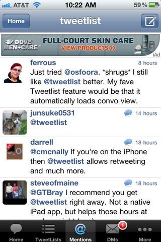 In principe zijn er al zoveel applicaties voor Twitter op de iPhone dat aandacht besteden aan een nieuwe app tamelijk zinloos is. Maar met de gratis versie van Tweetlist Pro is er een nieuwe uitgekomen die wel het bespreken waard is. Tweetlist is een all-in-one applicatie waarmee je alle aspecten van het sociale netwerk kan bedienen en extra nadruk ligt op de twitterlists. Bovendien laat de app een gigantisch aantal direct messages zien, waar andere cliënts voor de iPhone en iPod touch er vaak maar twintig tot honderd inladen.
