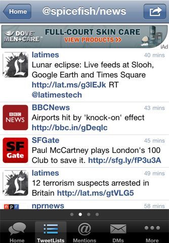Tweetlist heeft als tweede tabblad, nog voor mentions en direct messages, een tabblad ‘lists’. Als je daarop klikt, zie je automatisch de eerste op alfabet gerangschikte lijst die je volgt. Door naar rechts te swipen, kom je bij de volgende uit, net zoals de homescreens van de iPhone werken.