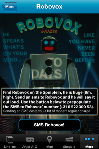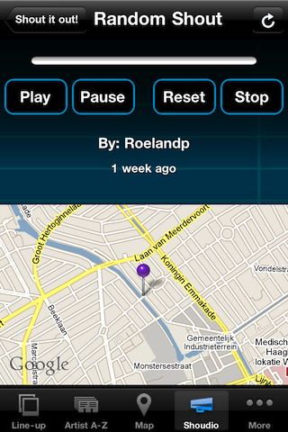 Ontwikkelaar Roeland P. Landegent heeft nog een leuk extraatje gebouwd voor de applicatie: Shoudio. Hiermee kun je tijdens het festival korte audiofragmenten opnemen, zoals een korte mening over iets dat je hebt gezien. Deze fragmenten worden vervolgens zichtbaar op de kaart van het festivalterrein. De bedoeling is dat de dienst later beschikbaar komt als losse applicatie.