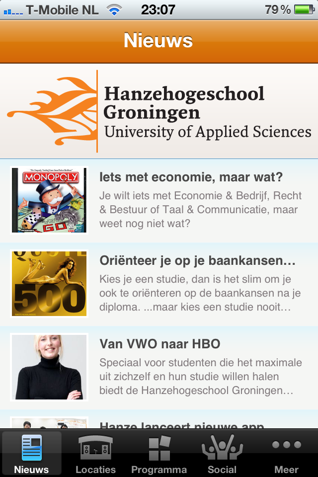Open Dag HanzeDe Hanzehogeschool Groningen organiseert aankomende zaterdag 5 november haar jaarlijkse open dag voor nieuwe studenten, waar zij kennis kunnen maken met de school en zich kunnen oriënteren op de studies die worden aangeboden. In plaats van een papieren brochure met alle informatie heeft men dit jaar gekozen om speciaal voor de open dag een gratis app voor iOS (iPhone) en Android uit te brengen: Open Dag Hanze.