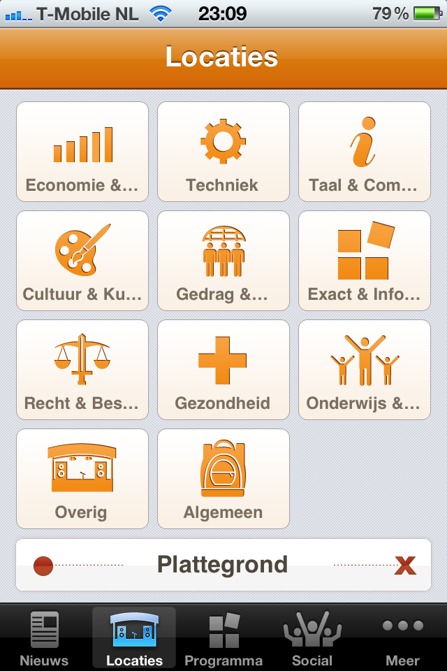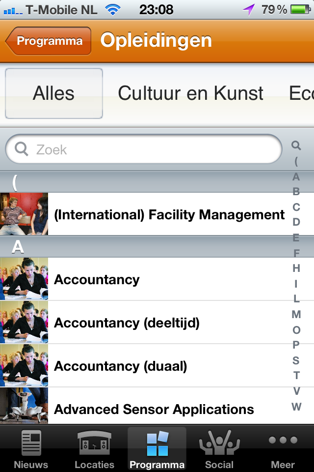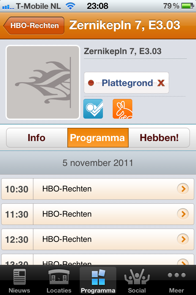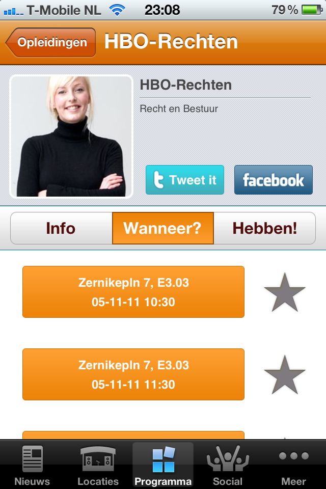 Via de tab “Programma” kun je als gebruiker zelf een programma samenstellen. Met de knop “Opleidingen” kun je bladeren door alle opleidingen die worden aangeboden, maar het is ook mogelijk om dit per onderwerp te doen, bijvoorbeeld “Recht & Bestuur”. Als je bijvoorbeeld geïnteresseerd bent in de opleiding HBO-Rechten, dan krijg je over die specifieke opleiding algemene informatie voorgeschoteld en heb je ook de mogelijkheid om meteen te kijken wanneer er voorlichting over gegeven wordt en waar dit plaatsvindt. Je kunt zelfs meteen een brochure bestellen, al word je daarvoor wel doorgestuurd naar een website; het is helaas niet mogelijk om dit binnen de app zelf te doen.