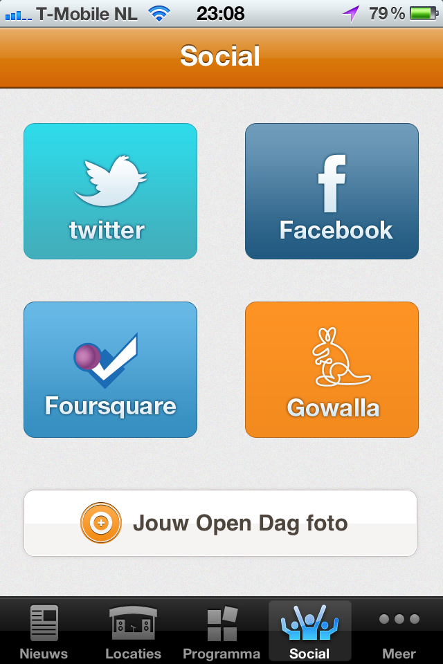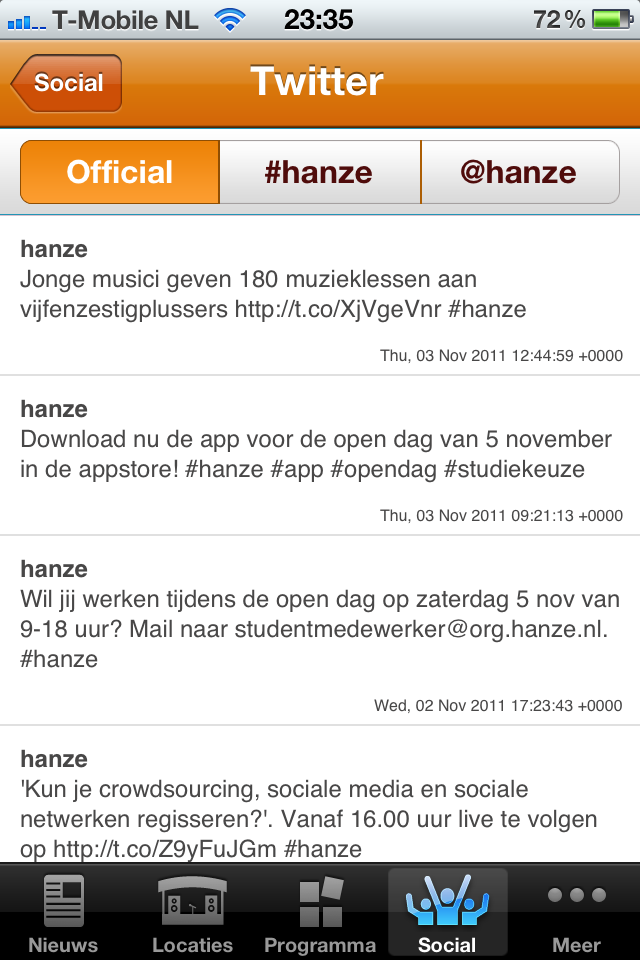 De app legt ook veel nadruk op het sociale aspect. Je kunt in de applicatie zien wat er door de Hanzehogeschool zelf getweet wordt en wat er door anderen via #hanze of @hanze op Twitter wordt geplaatst. Ook kun je meteen inloggen op Facebook om te zien wat er daar zoal over de Hanzehogeschool en de open dag wordt gedeeld. Ten slotte kun je meteen inchecken via Foursquare en Gowalla en zelfs (via Facebook) jouw eigen foto van de open dag versturen.