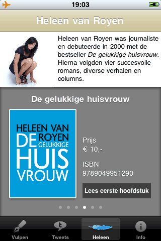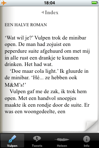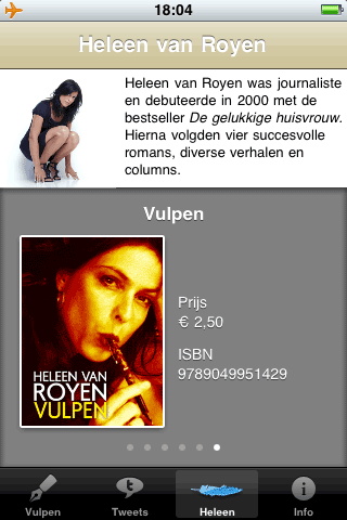 Onderin de applicatie zijn vier knoppen aanwezig: Vulpen (het boek), Tweets (de 10 recentste Twitter-berichten van de schrijfster), Heleen (een overzicht van andere boeken) en Info (credits en andere algemene info). Dat lijkt wat beperkt, maar er zit een verrassing in de applicatie: je kunt de eerste hoofstukken van Heleen’s andere boeken in deze applicatie lezen. Heb je de smaak te pakken, dan zul je de boeken vervolgens wel in de normale boekhandel moeten kopen, want ze zijn nog niet als e-book verkrijgbaar.