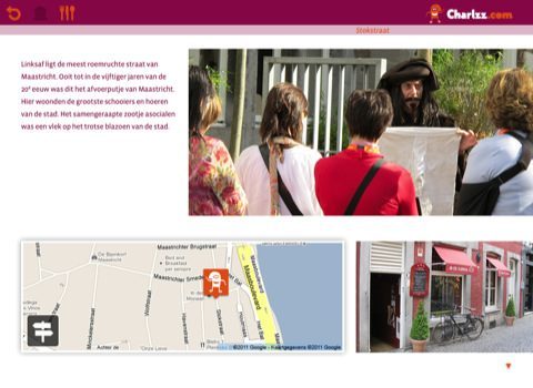 Het gevoel van Maastricht op de iPadHet gevoel van Maastricht heet de nieuwe iPad-applicatie van Charlzz.com, een online platform voor cultuur en recreatie in de grensregio Maas-Rijn. De app is een soort digitale promotiefolder voor de Limburgse hoofdstad. Het licht 15 locaties van Maastricht uit in tekst en bewegend beeld. Het gevoel van Maastricht telt meer dan 100 pagina’s en 250 foto’s. Er zitten meer dan 20 video’s en gesproken teksten in. Door naar rechts te scrollen, ga je naar een andere locatie. Scroll naar onder en je ziet meer informatie over het huidige onderwerp.