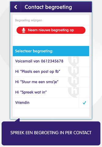 Dat je een begroeting kan inspreken die anderen horen als ze je bellen, is natuurlijk geen nieuwigheid. Dat je het per contactpersoon kan doen, is dat wel. De app heeft er een apart tabblad Begroetingen voor gemaakt, naast die van de ingesproken voicemails die je kan terugluisteren. In de instelling kan je ervoor kiezen dat een beller wel je begroeting hoort, maar dat ie geen boodschap kan inspreken. Een andere optie is dat alle voicemails automatisch worden doorgestuurd naar je mailadres.