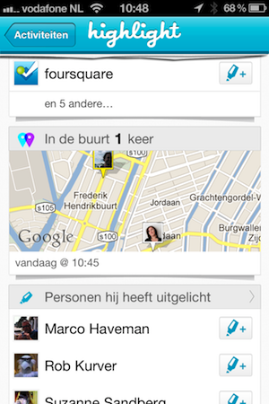 Nieuw zijn ook de interessepagina’s, die laten zien welke Highlight-gebruikers dezelfde hobby’s en interesses hebben. Ben je op een feestje en wil je weten of er fans van een bepaalde artiest zijn, dan heb je dat zó ontdekt. Wat er in je vriendenkring gebeurt volg je via de activiteitenstroom (activity feed), die in deze update van Highlight is uitgebreid met meer informatie, zoals de eerder genoemde vriendennotities en de Post Nearby-berichten. Je kunt een bericht liken en erop reageren, waarbij anderen meteen zien dat er op een verzoekje of vraag al gereageerd is. De mogelijkheden om alles wat je doet ook op Facebook te delen, zijn uitgebreid. Om je Facebook-vrienden niet op de kast te jagen dat je zo leuk met anderen in Highlight bezig bent, kun je ook eenmaal per dag een korte samenvatting publiceren op Facebook.