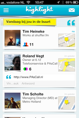 De iPhone-app Highlight heeft een update gekregen, die de grootste is sinds de app afgelopen maart in premiere ging. De app is nu volledig in het Nederlands (plus 9 andere nieuwe talen). Highlight heeft een nauwe integratie met Facebook, dus mocht je daar moeite mee hebben dan kun je beter naar een andere app uitkijken. Hightlight laat weten wanneer er mensen in de buurt zijn die je kent. Als je dat wil krijg je ook een waarschuwing bij mensen gezamenlijke vrienden of interesses. Eén van de nieuwe functies is ‘Post Nearby’, waarbij je een bericht kunt sturen naar mensen in de buurt. Zij ontvangen een push notificatie en een boodschap in hun activiteitenfeed. Zo kun je bijvoorbeeld naar een iPhone-pader vragen als je op een feestje bent en niet iedereen afzonderlijk erop wil aanspreken. Of vragen of er meer mensen zijn die een taxi willen nemen, zodat je de kosten kunt delen. De ontvangers moeten wel toestemming geven voordat ze de berichten ontvangen.
