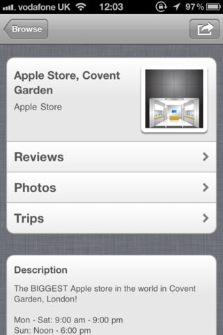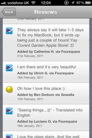 Highlights laadt alle achtergelaten recensies op Foursquare en Gowalla en geeft deze een universele beoordeling. Door aan te geven waar je precies naar op zoek bent in de app verschijnen er meerdere locaties op de kaart. Je kunt alle incheckrecensies er eens rustig op nalezen door erop te tappen. Alle genomen foto’s worden ook netjes onder de locatie gesorteerd, zodat je binnen een kijkje kunt nemen in een café voordat je erheen gaat. Belangrijke basisinformatie zoals de openingstijden, het telefoonnummer en het adres zijn ook terug te vinden.