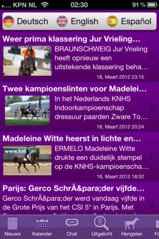 Er zijn nog veel meer rubrieken die je kan benaderen vanuit de scrollbare navigatiebalk onderin beeld. Een kalender laat aankomende evenementen zien, uitgelicht zet een ruiter in de spotlight, er zijn foto’s en video’s in verschillende categorieën, er is een (gesponsord) overzicht van bedrijven en specialisten en je leest allerlei tweets over paarden. Tenslotte is er ook nog het tabblad Jureren, waarin juryleden deelnemers aan wedstrijden in allerlei klassen kunnen beoordelen.
